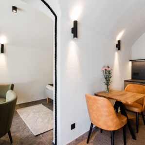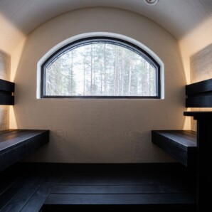 Im Inneren empfängt Sie durchdachtes nordisches Design: Kitchenette, gemütlicher Wohnbereich, Bad und eine private Sauna – mit Blick in den umliegenden Wald und auf die lappländischen Fjells. Sanftes Licht, Naturmaterialien und warme Töne schaffen eine ruhige, wohltuende Atmosphäre.